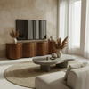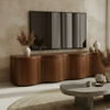 The Castello ETU features an eye catching wavy front shape with brushed brass fixtures and a prominent wood grain pattern.