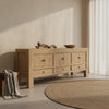 Its minimalist silhouette highlights the organic warmth of the timber, while four cupboard doors and four drawers provide generous concealed storage. Finished with antique brass handles, the Yunnan Buffet combines refined simplicity with enduring functionality.